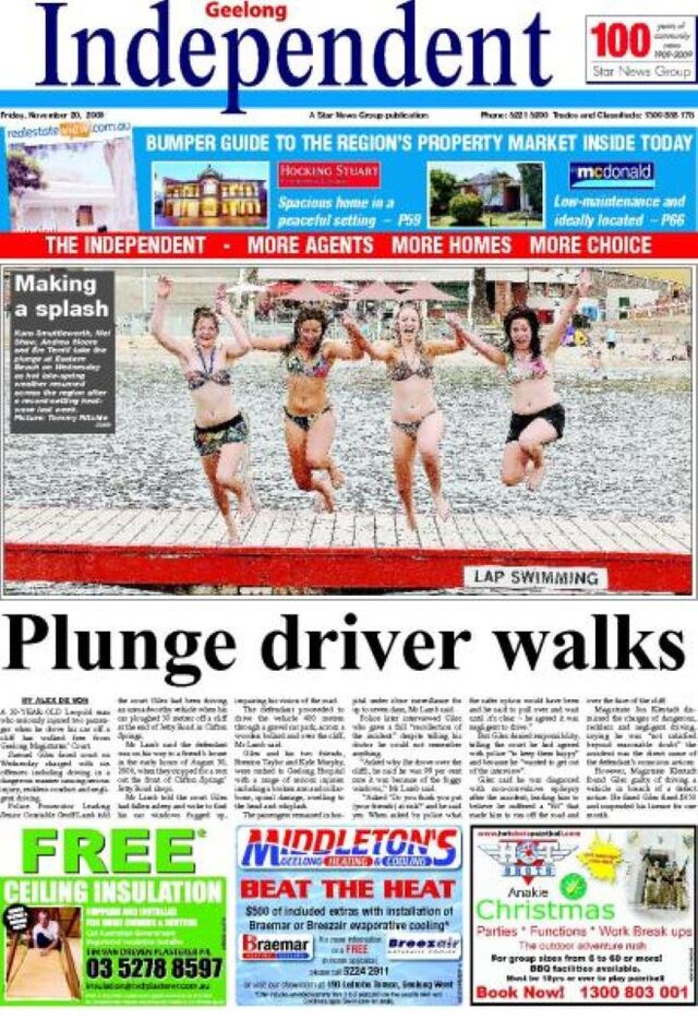 A 20-year-old Leopold man who seriously injured two passenger when he drove his car off a cliff has walked free from Geelong Magistrates’ Court.